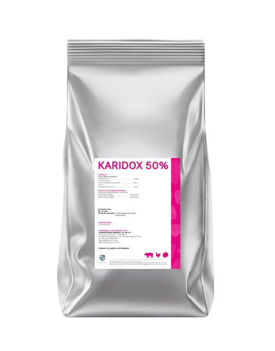 Administración oral en el agua de bebida. Porcinos y pollos: 23.1mg de doxiciclina hiclato por kg de peso vivo al día (equivalente a 40 mg de Karidox 50% polvo oral/kg de p.v), administrada en el agua de bebida durante 5 días consecutivos. Pavos: 28.8 mg de doxiciclina hiclato por kg de peso vivo al día (equivalente a 50 mg de Karidox 50% polvo oral/kg de p.v), administrada en el agua de bebida durante 5 días consecutivos.