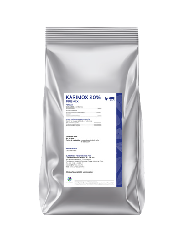 Karimox 20% Premix es un antibiótico semisintético perteneciente al grupo de las penicilinas. Tiene una acción bactericida en la inhibición de la síntesis de péptido, un componente esencial de la pared celular de la bacteria. El espectro de acción de Karimox 20% Premix resulta en numerosos microorganismos Gram-positivos y Gram-negativos como: Streptococcus spp., Diplococcus spp., Corinebacterium spp., Staphilococcus aureus, Haemophilus pneumoniae, Haemophilus spp., Listeria monocytogenes, Bordetella pertussis, Neisseria spp., Escherichia coli, Salmonella spp., Shigella spp., Proteus mirabilis.